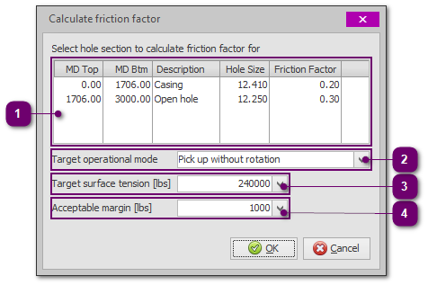 The target surface tension. The friction factor for the selected hole section is varied until the resulting surface tension (single depth) is within the specified margin. |