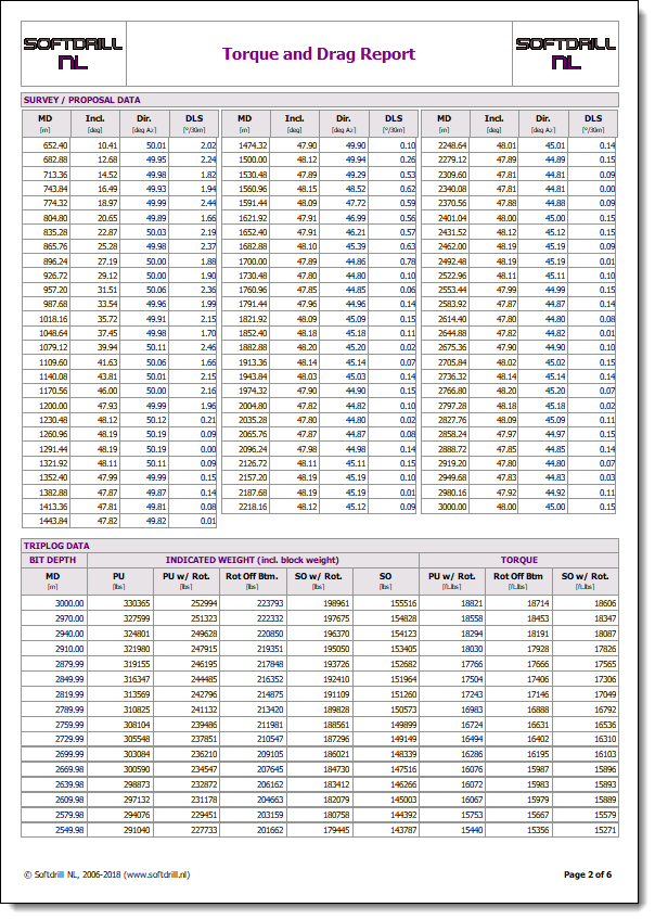 The printed report for Trip Log mode is similar to the Single Depth report. Only the Calculation Result table is replaced by a Trip Log data sheet listing surface tension (or indicated weight) and torque for each bit depth. Whether surface tension or indicated weight is printed depends on the Include Block Weight setting for the Torque & Drag model.