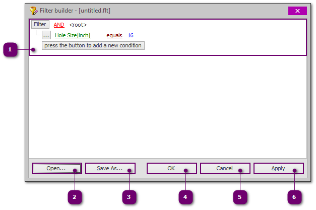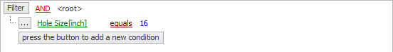 This grid is used to build the custom filter condition. Various parts of the grid may be clicked to add or remove a filter condition (filter row), change the filter operator (equals, not equal to, etc.) and so on. |