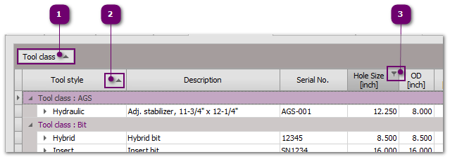 Grouping is achieved by simply dragging the header of a column into the grouping box. In the above example, tools are grouped by Tool Class. Multi-level grouping (e.g. Tool Class by Hole Size) can be achieved by dragging additional headers into the grouping box. If no grouping is applied, the grouping box will display the text "Drag a column header here to group by that column". |