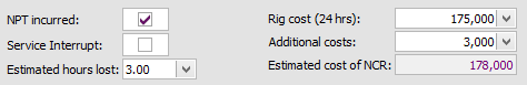 The Estimated cost of NCR is calculated as (Rig cost / 24) x Estimated hours lost + Additional costs.