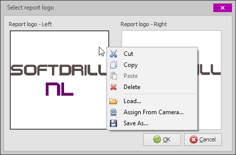 Right-click one of the logo boxes to access its context menu. Select the [Load...] option to select a bitmap (.bmp) file that should be used as the logo on reports.