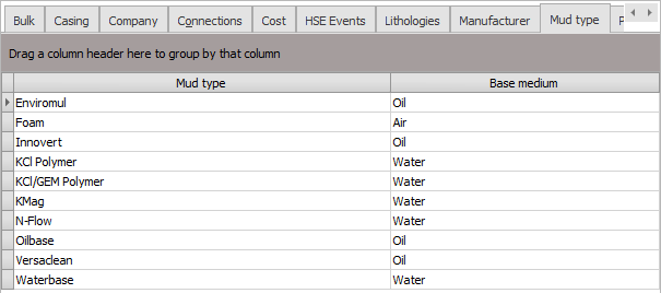 Mud types can be added as required. The Base Medium field specifies the fluid on which the drilling fluid is based.