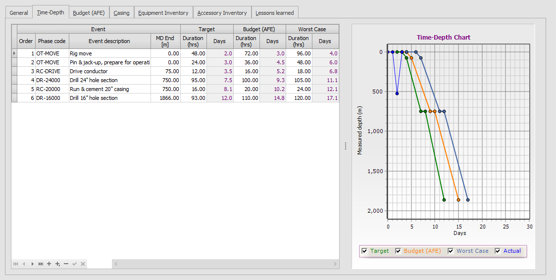 The time-depth chart is a graph of days versus measured depth for the well. The [Order] column can be used to sort the various phases of the well, where the Phase code column defines the type of phase (i.e. DR-16000 for drilling 16” hole). For each phase an ending MD must be entered, as well as at least one value in one of the three duration columns ([Target], [Budget] or [Worst Case]).