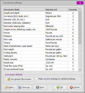 Units of measurement, as well as the number of decimals displayed, can be freely defined by the user as shown in the screenshot. Once defined, the settings may be saved to file. The file can be defined as a default so that all Softdrill NL programs automatically load the file upon start-up.