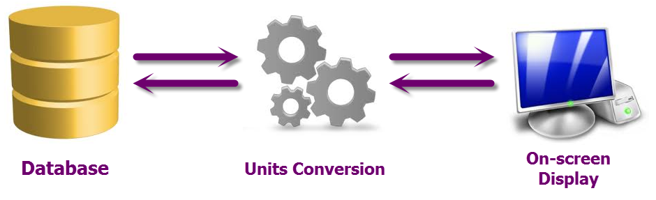 All Softdrill NL programs includes a proprietary framework that handles units of measurement. The framework converts data between storage (file or database) and on-screen or printed display. This process, as graphically depicted above, is fully transparent to the user and has several advantages: