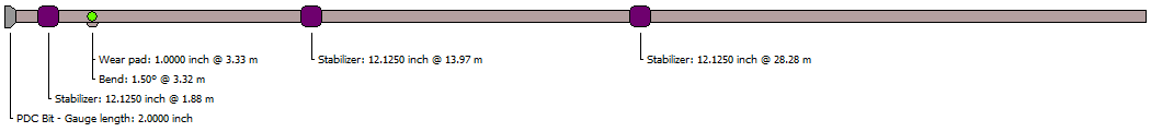 When performing all calculations for the BHA run, the composition and profile points are encoded. This process is invisible to the user but a simplified BHA schematic, showing all profile point with their dimension and distance from the bit, is drawn on screen or (optionally) printed on the BHA reports. An example of such a schematic is shown at the top of this page.