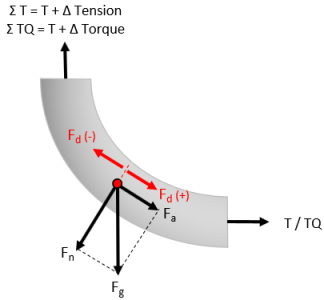 Then tension increase for each element is calculated from the axial force (Fa) for that element (corrected for the drilling fluid buoyancy factor). In addition, the drag force (Fd) is calculated from the normal force and the friction factor: