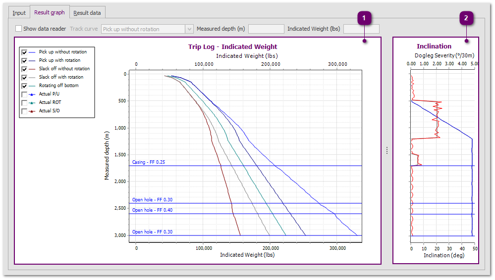 The trip log mode calculates the surface tension (or torque) against bit depth. In other words, the single depth model is calculated against a decreasing measured depth, starting at bit depth. At each step the surface tension (or torque) is stored and plotted on the chart.