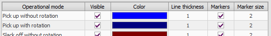 These settings control the appearance of the various tension/torque/normal force curves. They can be hidden, their color and line thickness can be changed and it can be defined to include markers of calculated points and the size thereof.
