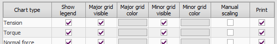 In this grid general setting for the different charts may be changed. Show legend controls display of the chart legend. Visibility and color of major and minor grid lines may be set per graph type. If the Manual scaling checkbox is checked, this means the chart was scaled with the mouse. Unchecking this box will rescale the chart to its original setting. The Print checkbox determines if the chart is included in the printed report. |