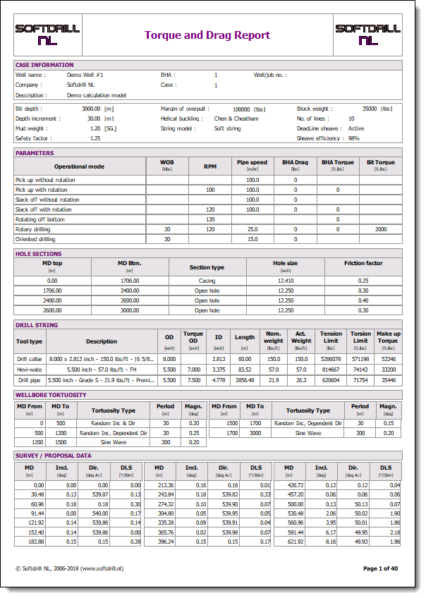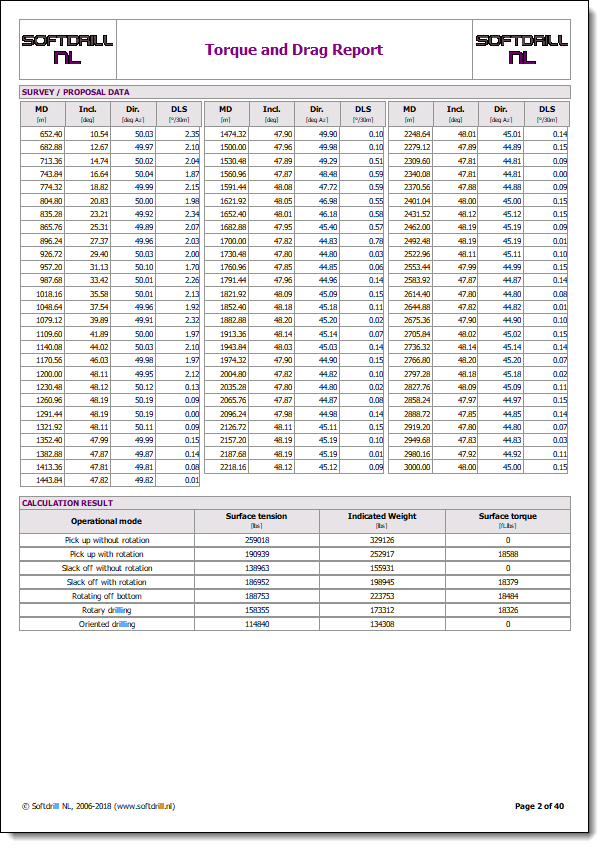 For the single depth calculation mode a report can be printed that provides an overview of all data input. If random wellbore tortuosity was applied to a wellplan, the resulting simulated surveys will be printed.