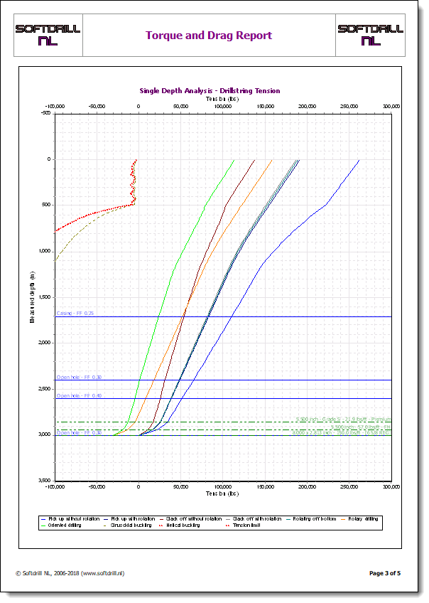 Just below the input data, the surface tension and torque are printed. If block weight was input and applied in the calculation, the indicated weight for the calculated surface tension values will also be printed. Subsequently one or more pages with charts (tension, torque, normal force are printed). Charts will be printed as shown on screen (scale, line colors, line thicknesses, etc.).