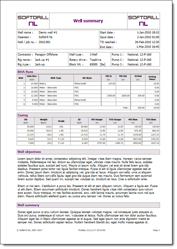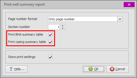 Optionally a table of casings and/or BHA runs may be included. Each table can be (de)selected via the print dialog box: