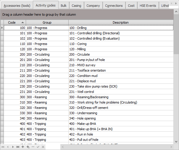 If it does become required to add a record, the Code field should have a non-existent value that falls within the Group (i.e. 100-199 for Progress, 200-299 for Circulating, etc.). The Group field value should be exactly the same as all other records within that group (i.e. ‘100 – Progress’ and not ‘100 – progress’). The Description field should always be in the format of a three digit code, a hyphen between spaces and a description (i.e. ‘100 – Drilling’).