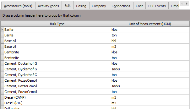 Bulk types may be defined for maintaining an inventory on the Daily Reports. As this is purely for administrative purposes, bulk stock is explicitly excluded from the units of measurements used in WellRep. Instead, the bulk is only labeled with a unit of measurement (UOM). Multiple bulk types may be defined with different units (i.e. the combination Bulk Type and Unit of Measurement must be unique). The data values (stock quantity) will not be converted when the UOM is changed!