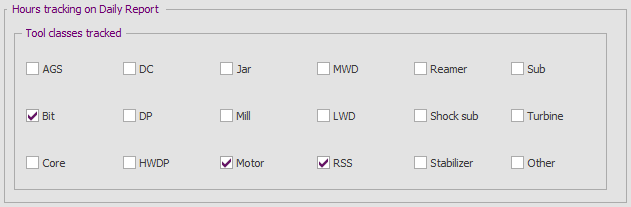 On the daily report form, hours for specific tool classes are calculated for the BHA's in use for that day. These hours are also printed on the Daily Report. In this section the Tool Classes to be tracked (default: Bit, Motor and RSS) may be adjusted.